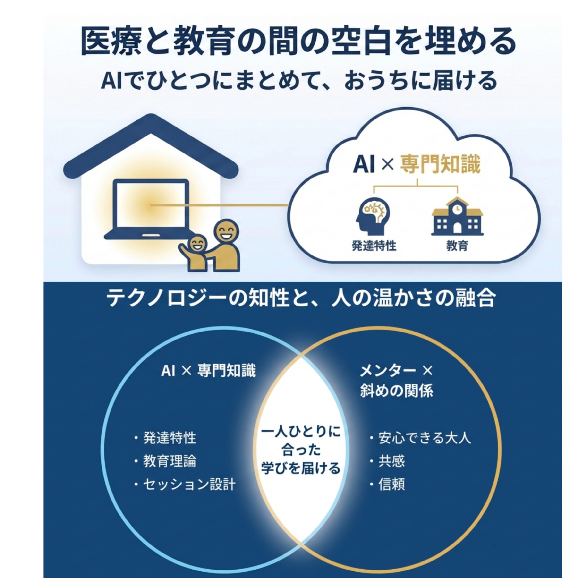 児童精神科医や作業療法士など10人以上の専門家から学んだ知見と、100回以上のセッションで蓄積した実践知をAIで体系化。子どもが好きなメンターが、一人ひとりに向き合います。お子さんへの週1回のオンライン学習伴走と、親御さんへの月1回の相談を組み合わせた「家族まるごとサポート」。